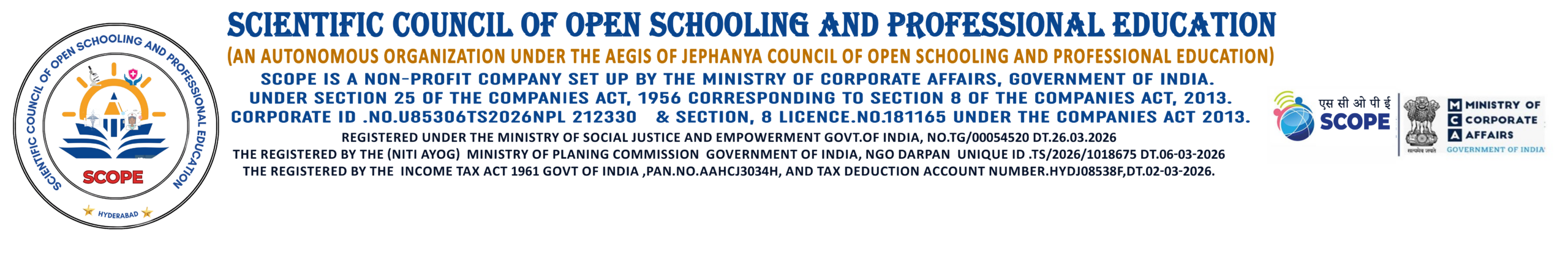The Scientific Council of Open Schooling and Professional Education (SCOPE) Under the Aegis of Jephana Council of Open Schooling and Professional Education Incorporated autonomous body Under the Section 8 of Companies Act 2013(18 of 2013) Ministry of Corporate Affiars, Government of India, Dt.02-03-2026 for industrial and vocational education and training Non-Profit Organization under Govt. of India, working in pan India with the mission of educational development and global peace in the main areas of all industrial vocational training and education, all kind of regular, private, academic, non-academic, distance correspondence education, Secondary and Senior Secondary/Intermediate Education free education and Allied health care ,Nursing and other professional felowships,internship ,for dropouts, underprivileged children of the society.conducts Non-formal Education, Online and Distance education mode, E-Learning Training Education, RPL Academic Education, and Value Added Courses, Certificate Courses, Diploma Courses, Degree Courses, Post Graduate Diploma Courses, Technical Courses, Management Courses and various sectors related to Skill and Vocational Education school educational, Arts & Technical Education courses.